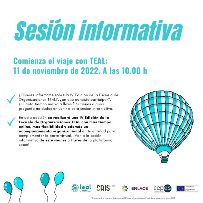 ¿Quieres informarte de en qué consiste participar en la Escuela de Organizaciones TEAL? En esta ocasión se realizará una IV Edición de la Escuela de Organizaciones TEAL con más tiempo online, más flexibilidad y además un acompañamiento organizacional en tu entidad para complementar la parte virtual. ¡Ven a la sesión informativa de este viernes, 11 de noviembre, a las 10.00 horas!