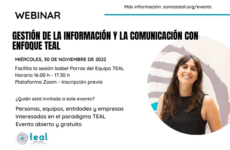 Desde un enfoque TEAL trabajaremos los diferentes tipos de flujos de información y la importancia de ellos en los procesos de transformación de las organizaciones. ¿Te gustaría conocer las diferentes flujos de información y conocer algunos ejemplos de comunicación abierta y transparente de organizaciones TEAL? Conoceremos y reflexionaremos sobre prácticas reales para reflexionar sobre una comunicación más TEAL. Te esperamos el miércoles 30 de noviembre, de 16.00 a 17.30 horas en la plataforma Zoom. ¡Puedes hacer la inscripción el botón de registro!