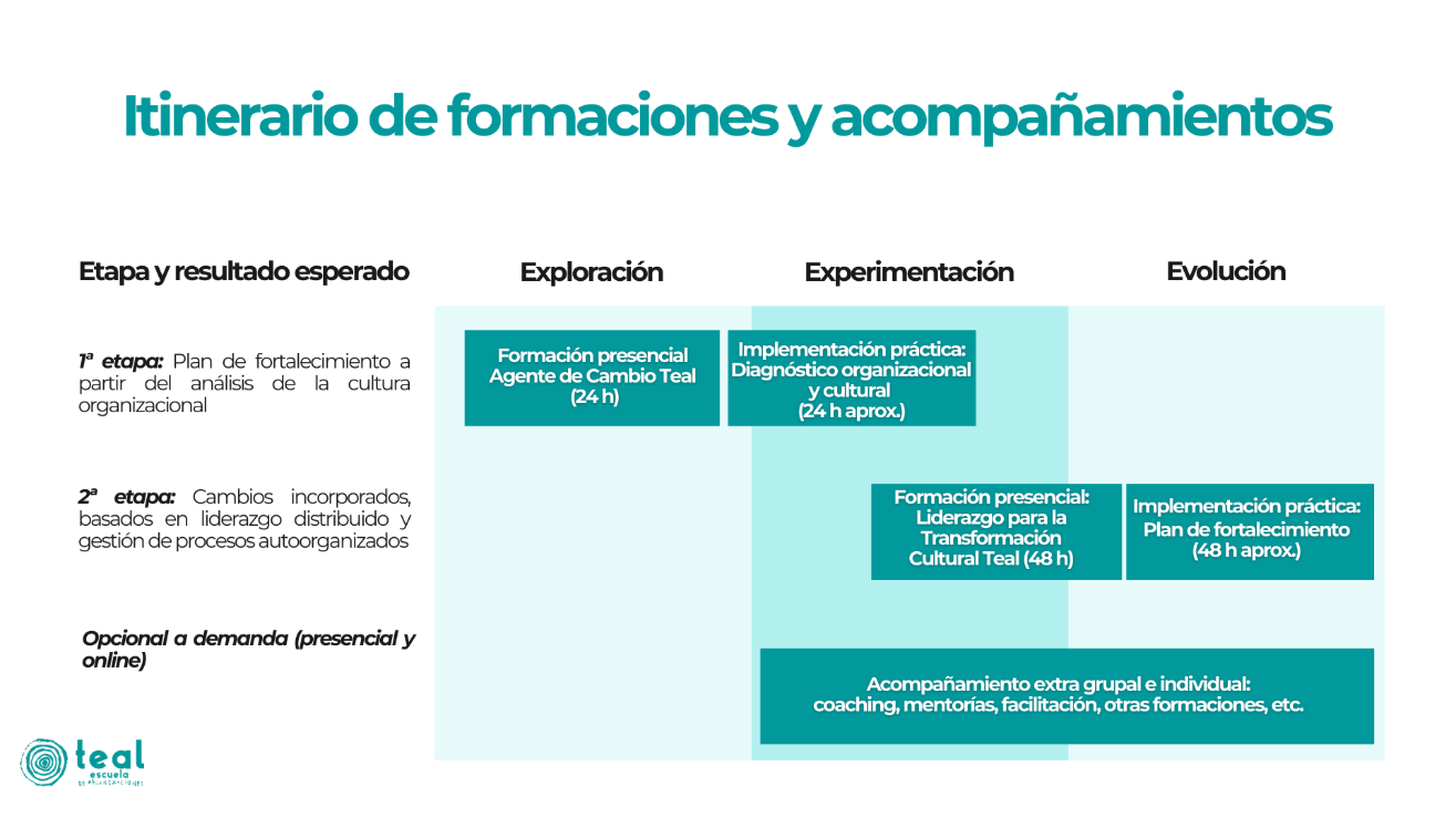 Agente de Cambio Teal: 24 horas de formación + 24 horas aprox. de trabajo individual y en equipo.