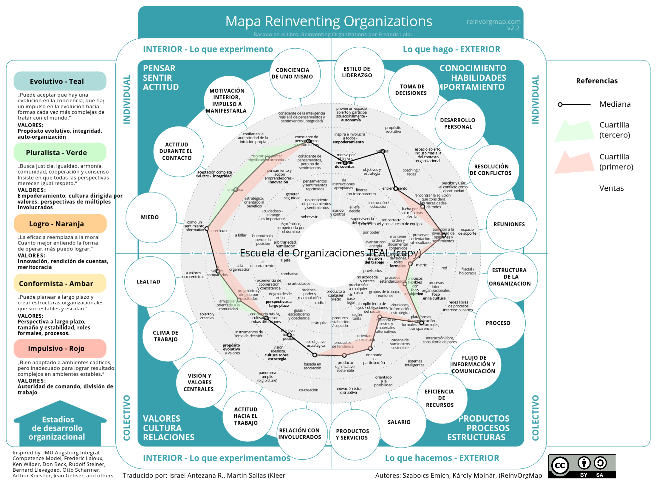 Los temas del diagnóstico, están integrados en los cuadrantes de la Teoría Integral. Realizaremos la valoración sobre el paradigma desde donde actúa y opera la organización a día de hoy para cada uno de los tema. El resultado, será un mapa como este.